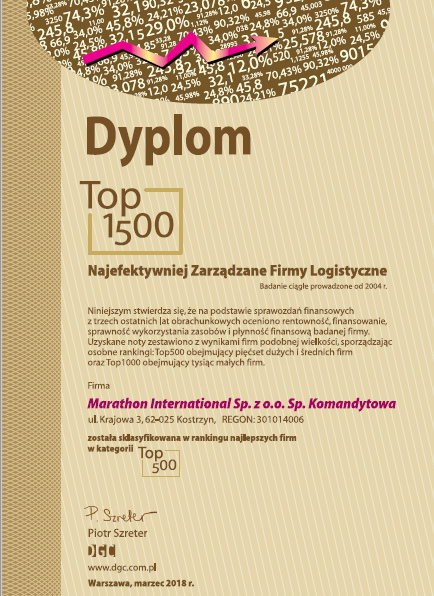 W 2018 roku, po raz kolejny ogłoszona została lista najefektywniej zarządzanych średnich i małych firm transportowych, wśród których znalazł się również MARATHON INTERNATIONAL. Wyłonienie najlepszych firm z branży i zestawienie ich wszystkich według kolejności w oparciu o zestaw kluczowych wskaźników opisujących rentowność, finansowanie, sprawność wykorzystania zasobów i płynność finansową ma za cel umożliwić wszystkim w branży dokonanie porównań i ułatwić wyszukanie firm, które stanowią dla nich samych punkt odniesienia.